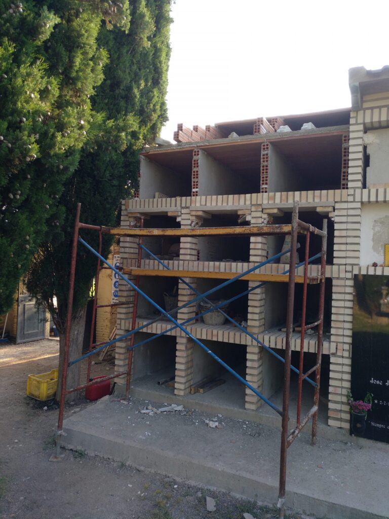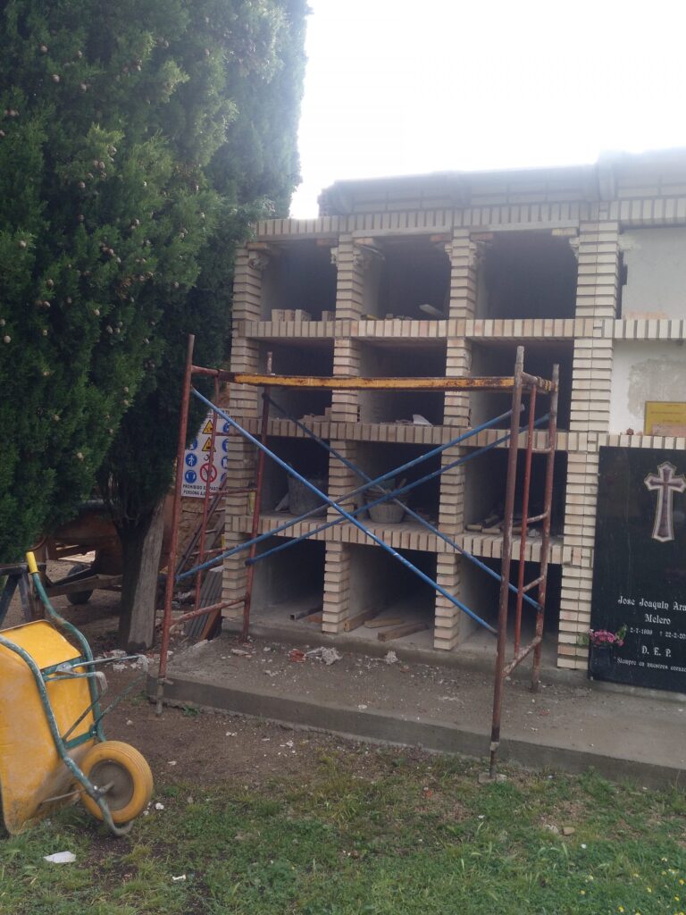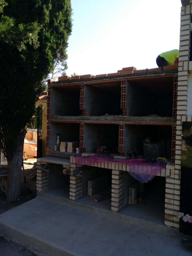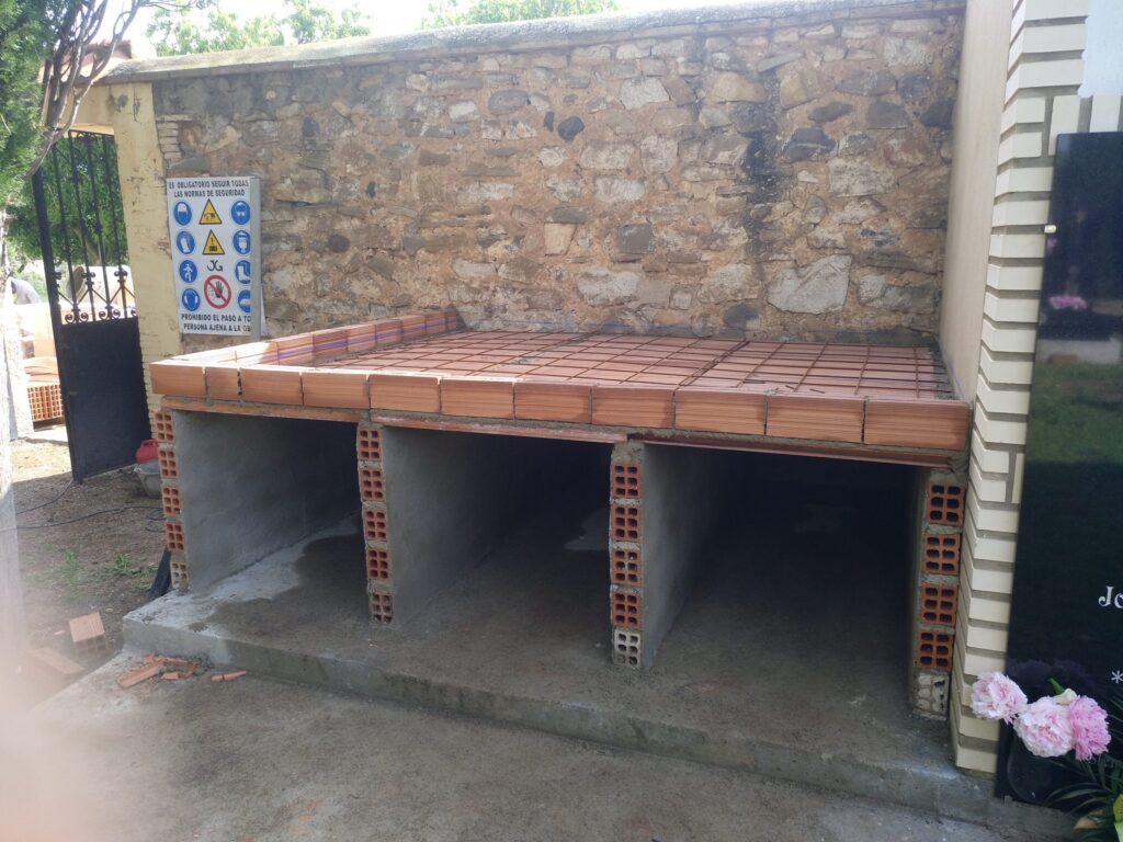 Se propone realizar la construcción de nuevos nichos con fábrica de ladrillo y losas horizontales mediante solera de hormigón armada de 10 cm de espesor, iguales a los existentes (75x65x250 cm). Toda la estructura del módulo de nichos irá rematada con una cubierta de teja de hormigón plana, con formación de voladizo de unos 50 cm mediante canetes y losas prefabricadas de hormigón.